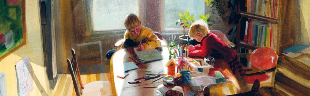 Cerco di non perdere di vista chi mi ha accompagnata in questa giornata, cerco di non rispondere al telefono ma continua a suonare senza sosta. Cerco di concentrarmi sui pannelli espositivi degli illustratori scelti di tutto il mondo. Penso che il tratto di una mano italiana è riconoscibile come lo è un volto; non so, a guardare queste cornici faccio a gara fra me e me per indovinare da dove provengono. La cosa mi fa sentire tranquilla, mi permette di perdermi nella luce di Sydney Smith, per esempio.