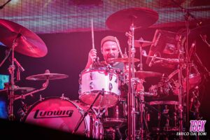 L’impianto scenico è stato all’altezza: luci stroboscopiche, proiezioni video, fumo, tutto calibrato per accompagnare la narrazione musicale senza sovrastarla.