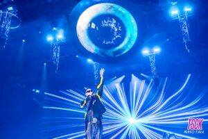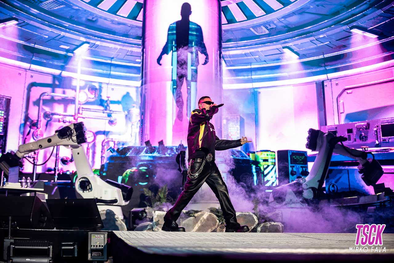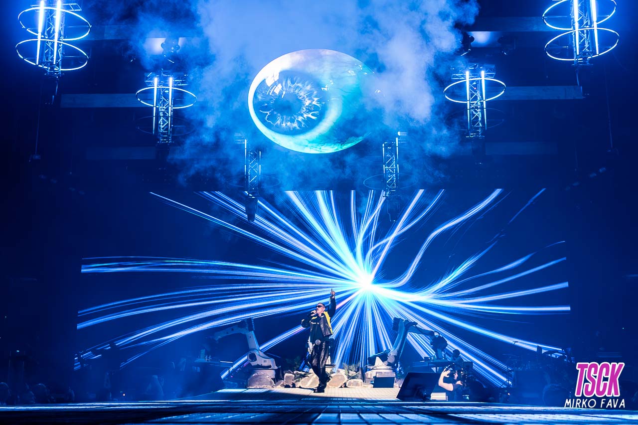 La scenografia è stata qualcosa di spaziale, il concetto infatti è che Fabio (ndr, il suo vero nome) e Marracash siano due entità distinte da far unire in un esperimento condotto grazie al concerto. All’occhio sono saltati subito i tre bracci meccanici FUNZIONANTI posizionati sul palco, utilizzati sia come camera per riprese speciali, sviluppare ulteriormente la scenografia e come luci di supporto.