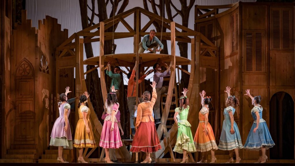 Le scenografie sono ricchissime e numerose: si passa con fluidità dalla canonica alla piazza, dal bosco alla casa del sindaco, fino all’arca, e già questo, oggi, è tutt’altro che scontato. La pedana rotante aiuta a rendere i cambi scena rapidi e dinamici, spesso accompagnati da raccordi musicali in cui gli attori partecipano attivamente allo spostamento degli elementi, mantenendo sempre vivo il ritmo.